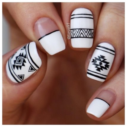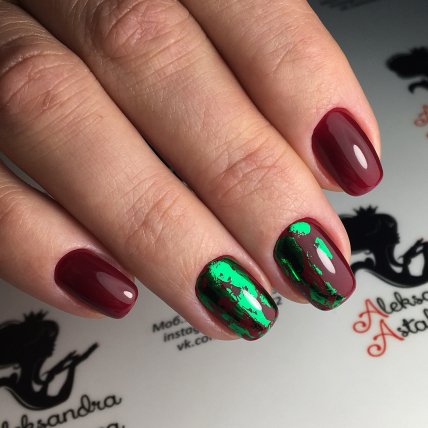 Кричащий френч из сочетания красного и черного, рисунок на одной из частей пластины или ровная полоска через весь ноготь – все это может стать частью такого вида нэйл-арта.