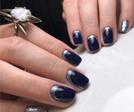 Антифренч носит еще одно название – лунный маникюр. В этой технике цветом выделяется нижняя часть ногтя –лунка. Остальные способы украсить такой маникюр можно перенять от предыдущей разновидности.