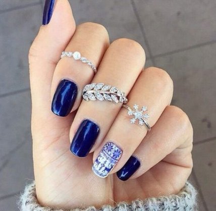 Различные формы и цвета лаков с блесками создадут новогоднюю сказку с гирляндами. Зимой в маникюре будет преобладать «холодная» палитра цветов, она действительно станет зимней, если ее украсить белыми кружевами, снежинками или добавить серебро и золото.
