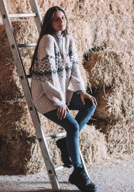 Кажется, это один из самых стильных вариантов очень теплого образа. Чтобы массивный свитер не увеличивал талию, просто заправьте его за пояс джинсов (они, кстати, должны быть на высокой талии). Получается молодежный, стильный, теплый, комфортный зимний образ.Длинные рукава