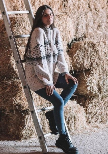 Кажется, это один из самых стильных вариантов очень теплого образа. Чтобы массивный свитер не увеличивал талию, просто заправьте его за пояс джинсов (они, кстати, должны быть на высокой талии). Получается молодежный, стильный, теплый, комфортный зимний образ.