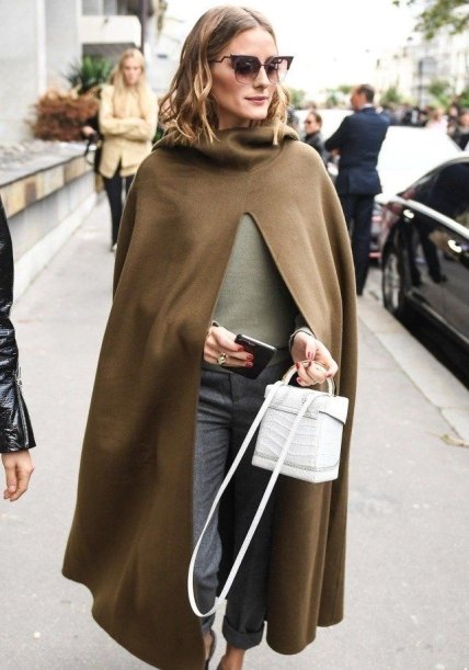 Если вам уже немного наскучили традиционные пальто, то пора обратить внимание на вот такие открытые плащи, которые уже успела полюбить Оливия Палермо. Вы будете чувствовать комфорт и тепло в такой одежде. Коричневый цвет всегда удачный, поэтому смело приобретайте такое пончо коричневого цвета для элегантных образов.