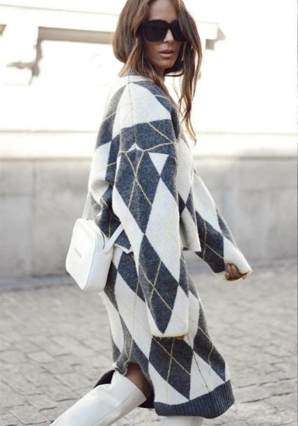 Очень теплый, сексуальный, женственный образ. Купите стильный свитер на два размера больше, наденьте плотные колготы (можно с трендовым рисунком) и подберите ботфорты на каблуке с высоким голенищем. Такая обувь сделает вас визуально выше и стройнее. Кроме того, подчеркнуть силуэт вам поможет широкий пояс. Комбинация свитера оверсайз и высоких сапог – это тренд, который покорил мир стритстайла.