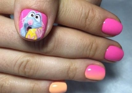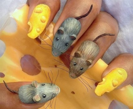 Если вам импонирует восточный гороскоп, то сделайте вот такой креативный маникюр с мышатами или крысятами. Так же можно найти интересные идеи в популярных историях о грызунах.