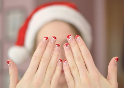 Красный френч можно превратить в тематический узор, если пририсовать к кайме кончики шапки Санта-Клауса с белыми помпончиками.