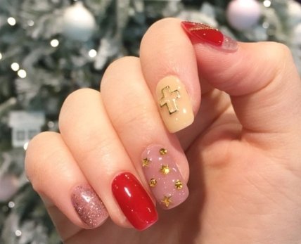 Красивый вариант христианского маникюра с модными цветами: бежевым, золотым и красным. Золотой крест и рождественские звезды добавили торжественности.