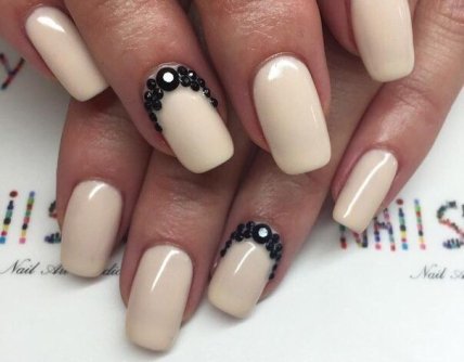 Длинные ногти в светло-бежевом цвете смотрятся очень эффектно. Такой стиль маникюра очень практичен, так как отлично подходит в любой ваш образ одежды. Пилочкой задаем квадратную форму ногтям. Лаком молочно-белого оттенка прокрасим аккуратненько всю ногтевую пластину. Яркий акцент делаем на безымянном пальце. Приклеиваем черные стразы в виде арки на ноготь. Простенький и нежный маникюр смотрится довольно эффектно.