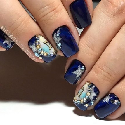Яркий, зимний маникюр. Он будет прекрасным дополнением к вашему новогоднему образу. Покроем ноготки синим гель-лаком с эффектом кошачьего глаза.Средняя длина и полуквадратная форма – идеальная основа для его создания. Серебренные звезды – броский акцент на ваших ноготках. Наклеим их на мизинец и средний палец. На безымянном, с помощью слайса, делаем рисунок зодиакального знака. Праздничности маникюру придадим стразами.