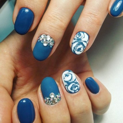 Синий цвет актуален в этом сезоне. Его мы используем в создании нашего маникюра. Короткие, овальные ноготки идеально подходят к нему. Лак наносим на каждый пальчик. Средний ноготь украсим стразами, так они будут выглядеть праздничнее. В свою очередь, на безымянном – рисуем белым акрилом розочки. Эти два пальчика мы покрываем матовым топом, а остальные глянцевым.