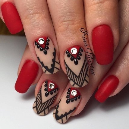 Матовые ногти стали одним из новшеств в мире моды. Очень часто их можно заметить на ручках наших модниц. Черный и красный цвета отлично гармонируют между собой. Такой маникюр хорошо выглядит на коротких ногтях квадратной формы. За основной берем темный тон. Красным гель-лаком делаем лунки. Матовый топ – финальная нота на ваших ногтях. Яркости образу придадим используя стразы. Наклеим их в треугольном виде на безымянный палец. Такие необычные ногти, эффектно подчеркнут ваш вечерний образ.
