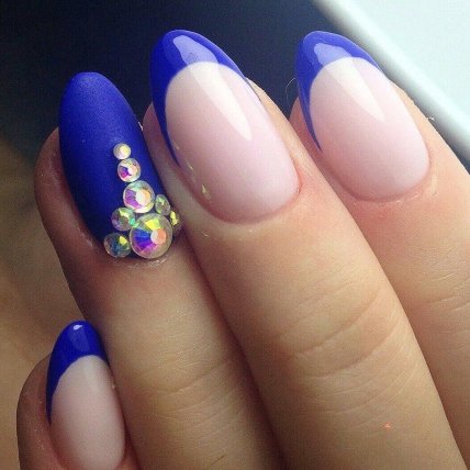 Синий френч все еще выглядит необычным, несмотря на то, что сам синий лак уже давно вошел в обиход. Сделайте такой маникюр на Новый год, используя для этого синий и молочно-розовый лаки, а также несколько крупных стразов. Френчевую "улыбку" делайте максимально глубокой, чему будет способствовать и овальная форма ногтей. Стразы прикрепляются на безымянный ноготь, полностью покрытый лаком и матовым составом.