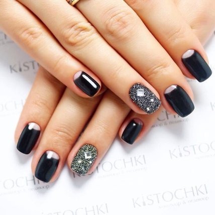 Черный маникюр, созданный по лунной технологии, поможет вам продемонстрировать безупречный вид ваших ногтей. Придайте им форму квадрата, а выемки лунок сделайте сглаженными. Таким образом, визуально ногти будут выглядеть действительно квадратными. Лунки окрашиваются светло-бежевым лаком, на безымянных ногтях можно сделать акцент с помощью серебряного глиттера и крупных квадратных стразов.