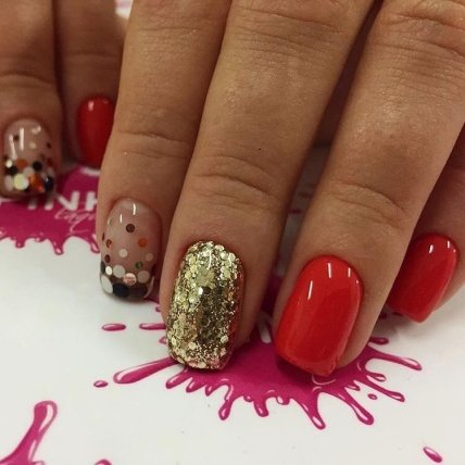 Новогодний образ должен быть ярким. Ваш маникюр соответствует ему. Красный и золотой цвета, идеальное сочетание для создание шикарного дизайна ногтей. Совместимость разных техник в роботе делаем ноготки более интересными на вид. За основной берем красный гель-лак. Им мы прокрасим ногти средней длины и квадратной формы. Средний ноготь всыпаем золотистыми блестками. Безымянный – разноцветными, в виде французского маникюра.