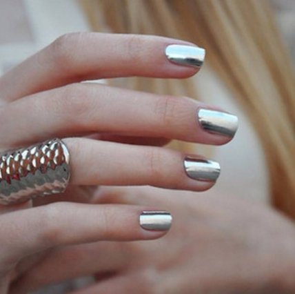 Такой маникюр сделает вас заметной в любой шумной компании. Создан он на базе техники металик. Металлический и зеркальный маникюры сегодня очень популярны. Используйте специальную маникюрную фольгу для того чтобы сделать ногти эффектными. Придайте им квадратную форму, а длина здесь не имеет значения.