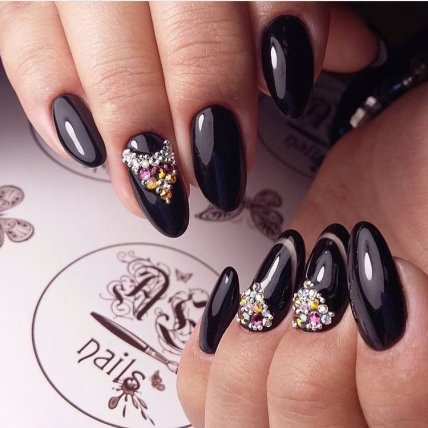 Глубокий черный цвет всегда придает особую элегантность маникюру. Обратите внимание, с каким вкусом сделан этот вариант, что на фото. Овальная форма ногтей и интересное отделочное решение, которое представляет собой нечто среднее между френчем и лунной техникой, создает уникальный эффект. Ногти чем-то напоминают устричные раковины, а богатая отделка ярким декором придает им гавайскую роскошь.