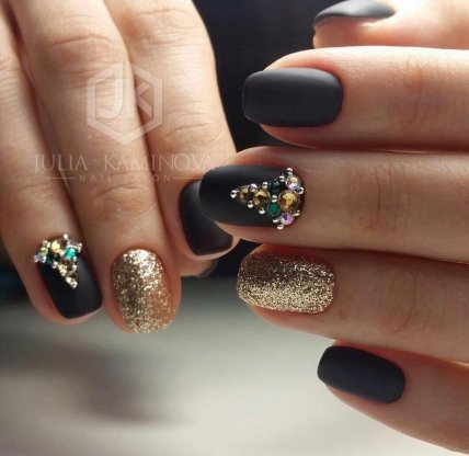 Черный цвет в сочетании с золотым – это роскошный праздничный вариант ногтевого дизайна. Такой маникюр будет идеальным для того, чтобы сделать новогодний маникюр. Покрытие золотистым текстурным составом безымянные ногти являются неотъемлемой составляющей праздничной концепции. А елочки, созданные из ярких стразов на лунках отдельных ногтей, подчеркнут ваше намерение встретить Новый год с размахом.