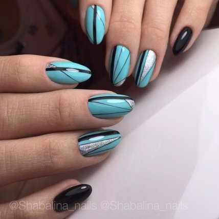 Геометрический узор на ногтях пользуется большой популярностью среди молодежи. Голубой и черный цвета гель-лака прекрасно сочетаются. Нанесем их на ногти в любом порядке. Длинные, овальные ногти – основа в этом маникюре. Темным лаком прокрасим два ноготка. Остальные накрасим голубым лаком и поверх него рисуем черные полоски. Отдельные сегменты узора зарисуем серебряными блестками. Такой яркий маникюр идеально подчеркнет ваш стиль.