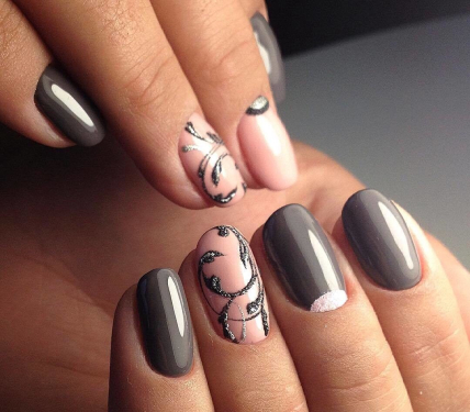 Сочетание серого и бледно-розового тонов, смотреться очень нежно. Использовав их в своем маникюре, вы подчеркнете вашу женственность и романтичную натуру. Он безупречно выглядит на ноготках средней длины и овальной формы. Серым оттенком прокрасим ногтевую пластину. На безымянном пальце красим тоном по светлее. Поверх него рисуем серебристыми блестками ажурный узор. Финишное покрытие закрепит ваш маникюр.