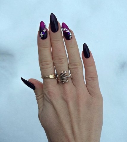 Для наращенных ногтей стоит придумать эффектный маникюр, который подчеркнут и их красоту, и вашу собственную индивидуальность. Мастер предлагает вам сделать праздничный маникюр, где использована техника градиента. Темно-синий и пурпурный лаки гель-лаки подойдут для этого лучше всего. Придайте ногтям заостренную форму, градиент наносится только на указательный и безымянный. Украсьте их стразами.