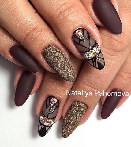 Яркий, новогодний маникюр. Ваше вечернее платье,будет красиво дополнятся ним. Длинные наращенные ногти в миндалевидной форме идеальная основа для его создания. Безымянный палец скрасим золотистыми блестками. Покрываем ими весь ноготь. На среднем пальце рисуем геометрический узор. Камни и мелкие стразы придадут праздничности. Наклеим их на ноготь. Остальные пальчики покрываем коричневым лаком с матовым эффектом. Идеальный маникюр для вечеринок и праздников.