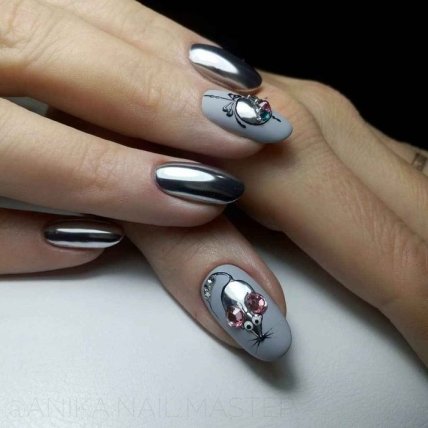 Нынешний сезон также насыщен серебристыми тонами. Именно серебро является главным украшением женских луков, так как год посвящен «Белой и Стальной крысе». Поэтому стилисты рекомендуют использовать данный оттенок в исполнении праздничного маникюра.