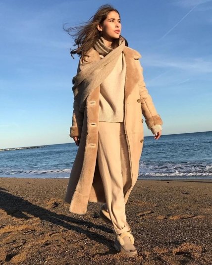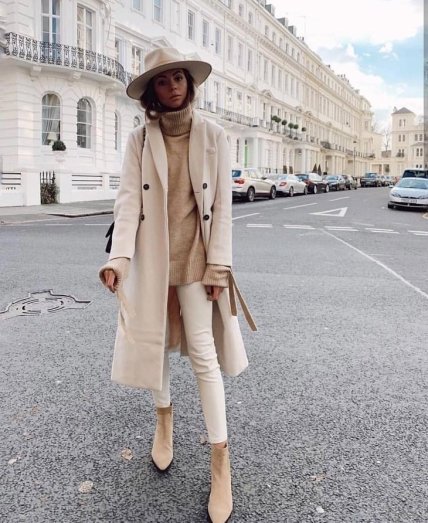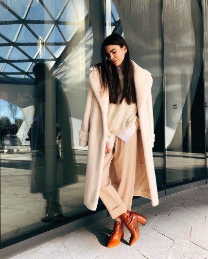 Следующая фотография наглядно показывает, как прекрасно смотрится сочетание светло-бежевого с темным бежем. Более темный оттенок в данном луке выступает в роли яркого акцента.