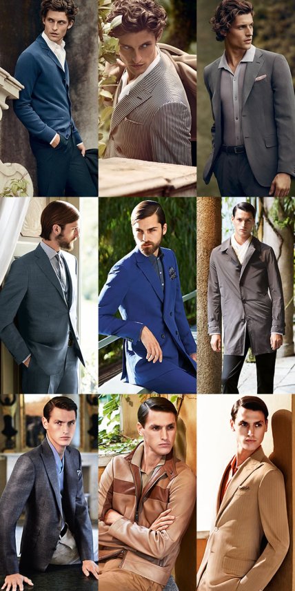 Образы Marni и Versace более юны, с включением техничных аспектов пошива. Например, визиткой Marni считаются свободные брюки с завышенной линией талии. Ну а Giorgio Armani и Ermenegildo Zegna специализируется на идеально покроенной шикарной мужской одежде. Их пиджаки имеют бутоньерки и воротнички, иногда контрастирующие по расцветке с основной тканью, а также высокие проймы и конические швы. В общем, это типичные итальянские вещи, в которых и пошив и стиль на самом высоком уровне.