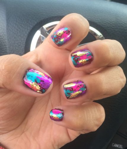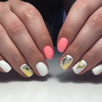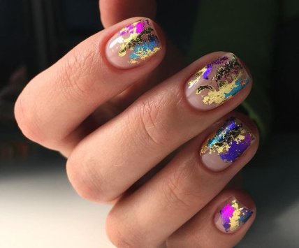 Также обрати внимание на новый тренд в подобном дизайне ногтей – маникюр с разноцветной фольгой, включая розовую, синюю, бирюзовую, красную, изумрудную и другие палитры.