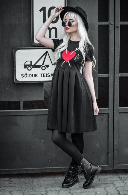 Вам больше нравятся бунтарские стили вроде панка или готики? Тогда создайте почти полностью черный образ с единственным ярким акцентом – рисунком алого сердца. Дополнить наряд можно такими неформальными деталями как грубые берцы, необычные очки или черная шляпа-трилби.