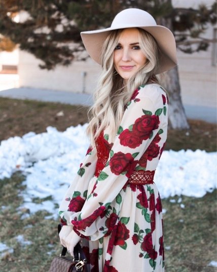 А вот этот наряд наверняка оценят те, кто любит привносить в образ элементы богемного стиля. Выбирайте легкое платье с просторными рукавами и шляпку-слауч с покатыми полями. Хм… как бы так ненавязчиво намекнуть любимому, чтобы подарил пышный букет роз? Точно, нам нужен цветочный узор с розовыми бутонами.