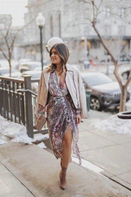 Легкое как перышко летнее платье со змеиным принтом будет смотреться великолепно. Конечно, если вы собираетесь много гулять по улицам, а на дворе холодно, то лучше выбрать что-то теплое. Платье-халат можно будет дополнить гольфом. А можно просто надеть вязаное платье, тогда вы точно не замерзнете. Тут главное не прогадать с цветовой гаммой. Животный принт довольно агрессивен, так что для нежного облика стоит выбрать палитру с мягкими оттенками розового или персикового.