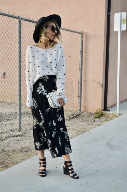 Вам понадобятся: струящаяся юбка длины миди или макси, широкополая шляпа-федора и свитер из натуральной шерсти. Для передачи атмосферы праздника можно добавить детали любовного характера. Это может быть узор в горошек в форме сердечка и очки с оправой, выполненной так же в форме сердца.