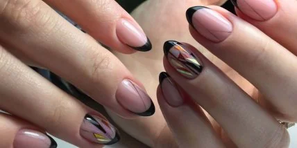 Вы можете использовать в паре с черным золотую или бронзовую фольгу, которая будет находиться по всему периметру ноготка, или лишь на кончике.