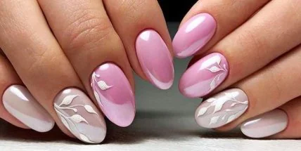 На пальцах, тронутых первым весенним загаром, очень освежающе смотрится пастельный сиренево-розовый маникюр. Выбор нежных оттенков и цветочный рисунок создают общую романтическую тональность дизайна. А чтобы покрытие не выглядело монотонным – на безымянных пальцах делается акцент. В идеале фантазийный рисунок в лилово-фиолетовой гамме выполняется в технике водного маникюра, но ради экономии времени можно воспользоваться наклейками.