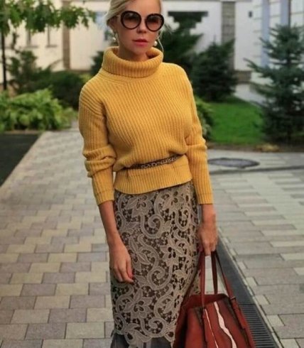 Стильное и оригинальное сочетание джемпера крупной вязки и юбки-карандаш из ажурной ткани.