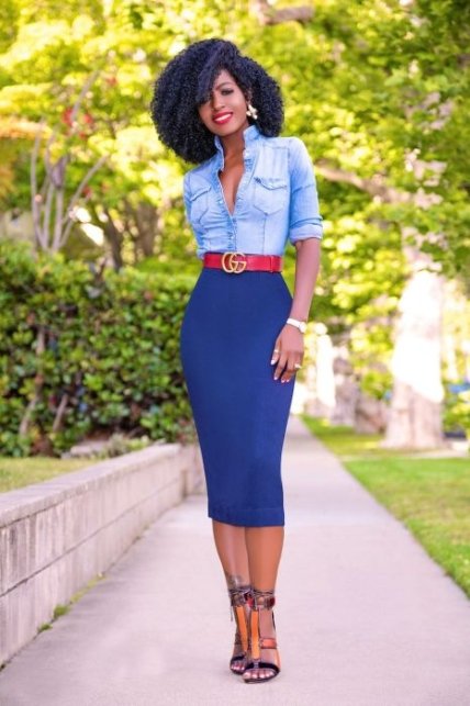 Стильное сочетание джинсовой рубашки и юбки-карандаш.