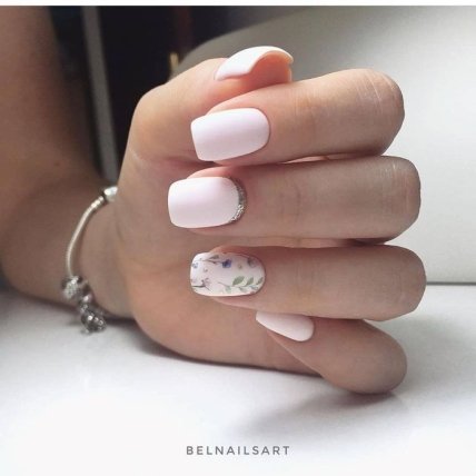 Миниатюрные веточки и цветочки, выполненные в стиле минимализм, красиво дополнят однотонный маникюр на коротких ноготках, разнообразят строгую классику френча и дополнят романтическими нотками любой образ.