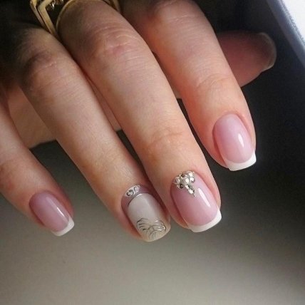 Сдержанность френча мастера рекомендуют разбавлять миниатюрными рисунками, глиттером, стразами, блестящей фольгой, бусинами и любыми другими декоративными элементами.