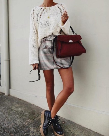 Ботинки отлично подходят к мини-юбкам из кожи. А шнурова придаст образу дерзости. Если же юбка более классического пошива, стоит отдать предпочтение ботинкам на каблуке, лучше высоком. Цвета выбирайте нейтральные.