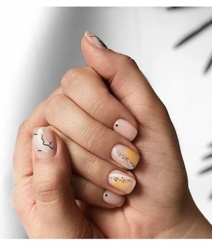 Используйте в качестве базы для потрясающего маникюра 2020 весна лак желтого, оранжевого, розового, голубого оттенка. А потом добавляете модную фишку – черные точки у основания каждого ноготка.