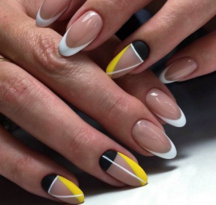 Если привычный французский маникюр кажется слишком скучным, добавьте некоторым ноготкам цвета и геометрических линий.