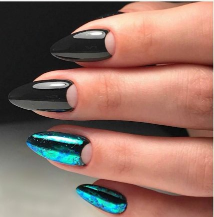 Поистине космический дизайн, выполненный с использованием фольги, отпечатанной на двух пальчиках. Остальные ногти украшает обратный френч в черном цвете.