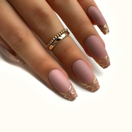Весьма интересный вариант дизайна длинных ногтей с использованием благородного розового оттенка и тонких золотистых полосок, наклеенных на свободный край ногтя.