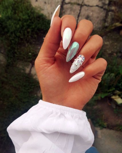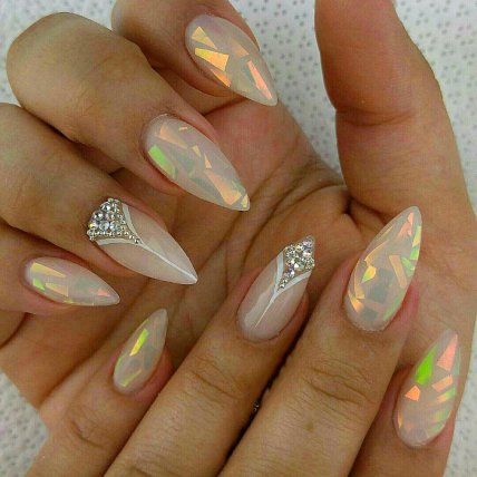 Форма стилет снова на пике популярности, а придать длинным острым ногтям еще больше шика и лоска поможет модный дизайн с использованием жемчужной втирки. Некоторые ноготки можно дополнительно украсить стразами или жемчугом.