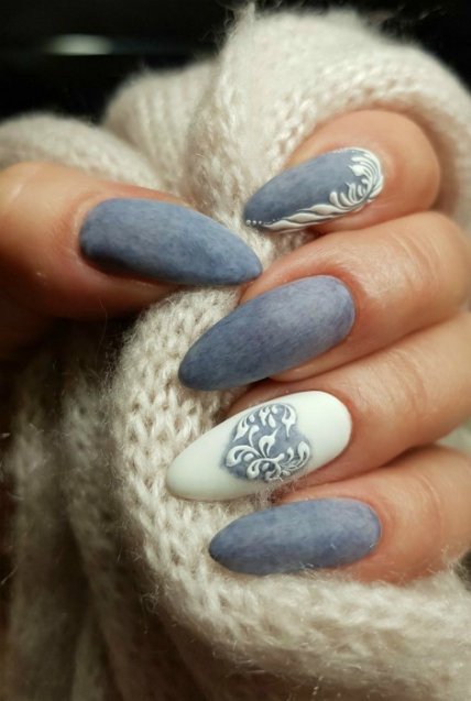 Потрясающий фактурный маникюр в серо-белых оттенках с изображениями вензелей и сердца на отдельных пальчиках, выполненный на длинных миндалевидных ноготках.