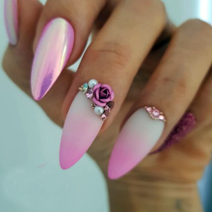 Маникюр, в котором использовано несколько видов дизайна: втирка с эффектом металлик, блестки, а также растяжка цвета, дополненная инкрустацией и объемным цветком. Подобная идея прекрасно подойдет девушкам, которым сложно остановиться на одном варианте дизайна.