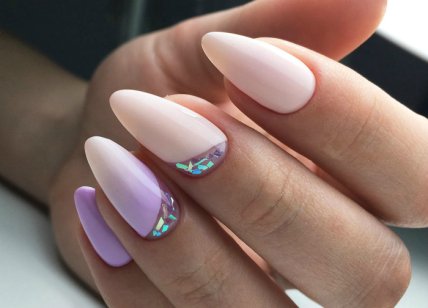 Оригинальный маникюр, выполненный в нежных оттенках, дополненный "битым стеклом" - выглядит достаточно свежо и необычно на длинных миндалевидных ногтях.