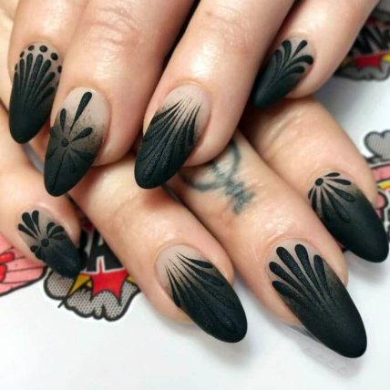 Длинные овальные ногти, украшенные растяжкой цвета от телесного до черного и дополненные объемными фактурными узорами.