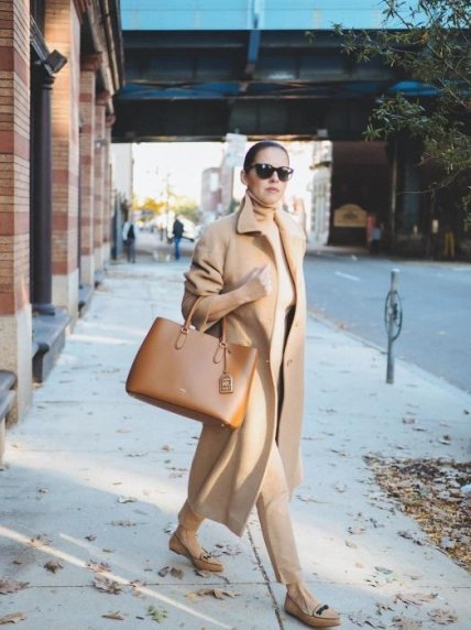 Для тех, кто не любит черный и не готов к ослепительной эффектности белого, идеальной историей станет бежевый total look. Бежево-карамельная гамма универсальна и подходит для разных случаев: от делового ужина до романтического свидания. Если белый аутфит больше подходит для лета или для сухой погоды, то бежевый комплект можно носить круглый год.