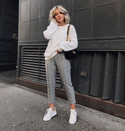 Минимализм – это не только монохромные образы, но и сочетания нейтральных цветов. Классическая комбинация – черный с белым. Не забываем еще об одном ахроматическом цвете – сером. Он богат разнообразными оттенками и способен выглядеть очень стильно и статусно. Как пример: можно примерить аутфит из серых брюк, скомбинировав их с обувью, джемпером или другим верхом в ахроматических цветах.